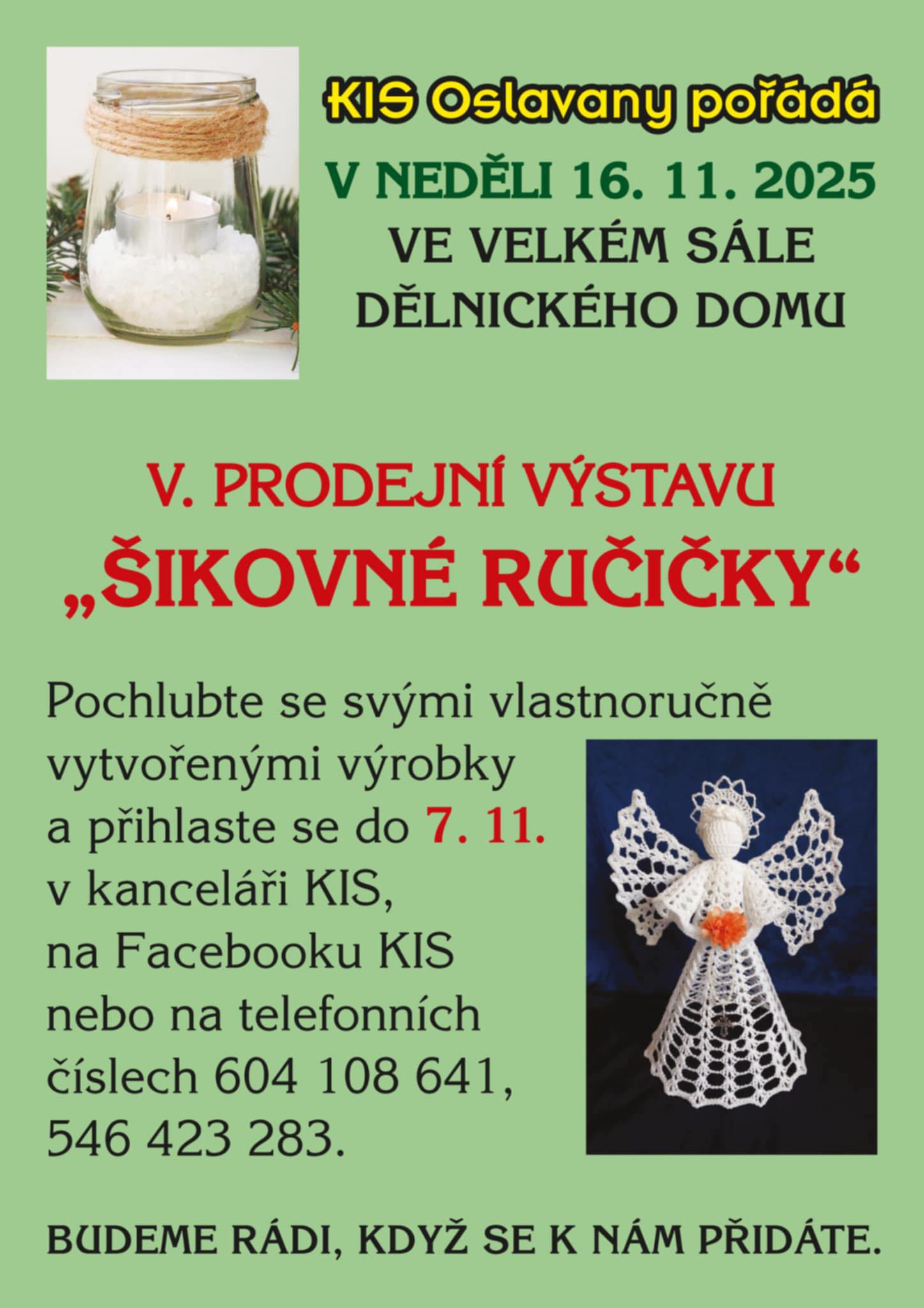 Pozvánka na tradiční akci - V. PRODEJNÍ VÝSTAVA - ŠIKOVNÉ RUČIČKY, která se uskuteční v neděli 16. 11. 2025 v prostorách Dělnického domu v Oslavanech od 10 do 17 hodin.