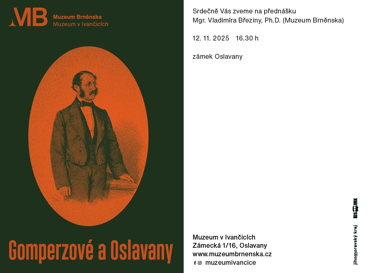 Pozvánka na přednášku s názvem: GOMPERZOVÉ A OSLAVANY, která se uskuteční ve středu 12. 11. 2025 od 16:30 hodin ve výstavních prostorách Muzea Brněnska pobočky Muzeum v Ivančicích (prostor po bývalém pivovaru na zámku v Oslavanech u Brna).