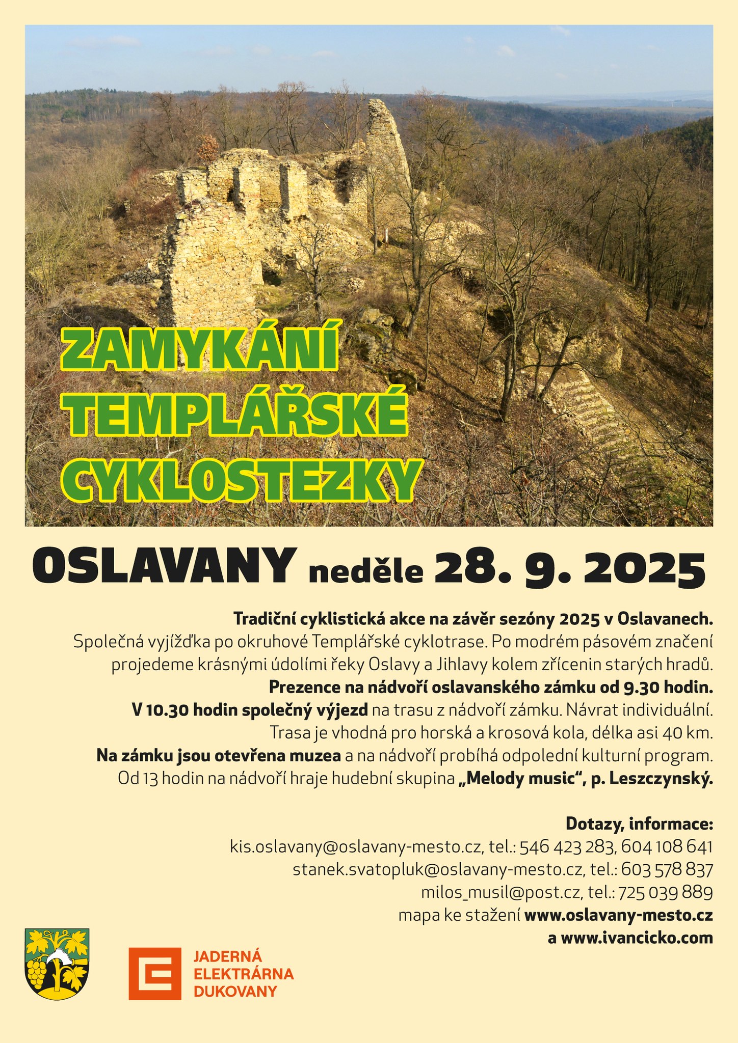 Novinky24.9.2025, Pozvánka ZAMYKÁNÍ TEMPLÁŘSKÉ CYKLOSTEZKY v OslavanechPozvánka na tradiční ZAMYKÁNÍ TEMPLÁŘSKÉ CYKLOSTEZKY, které se uskuteční v neděli 28. 9. 2025 na nádvoří zámku v Oslavanech u Brna.